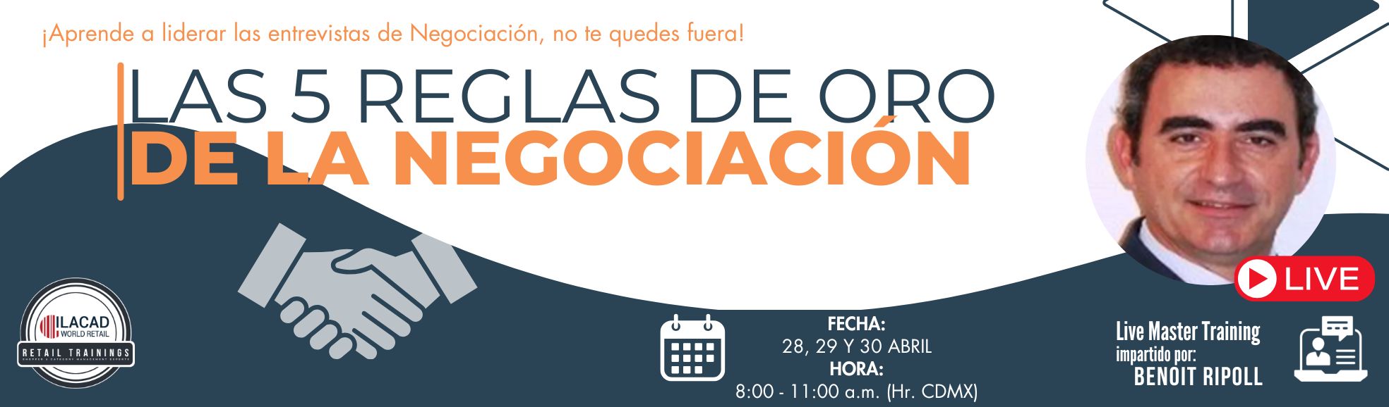 Las 5 Reglas de Oro de la Negociación es dictado por Benoit Ripoll, consultor internacional experto en negociación, desarrolló y aplica desde hace más de 20 años el método “Las 5 reglas de oro para negociar bajo presión”, basado en su experiencia ejecutiva en L’Oréal y como director de hipermercados Carrefour.